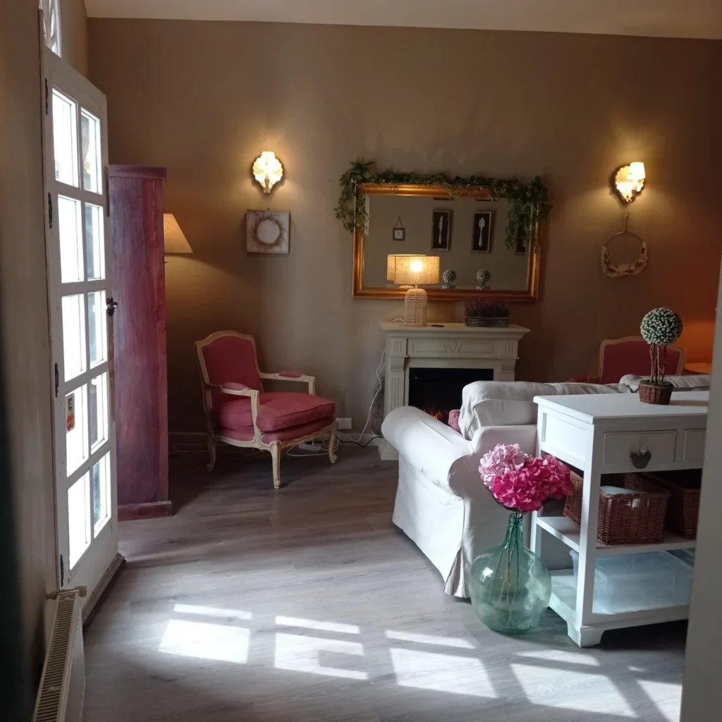 Cuenta con un salón confortable con chimenea decorativa y acceso directo al exterior, donde podrás desayunar al aire libre junto al estanque natural. Un espacio pensado para descansar, desconectar y disfrutar del entorno con total tranquilidad.