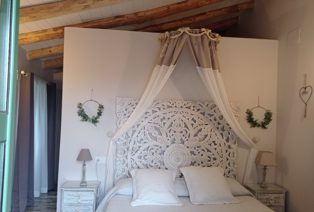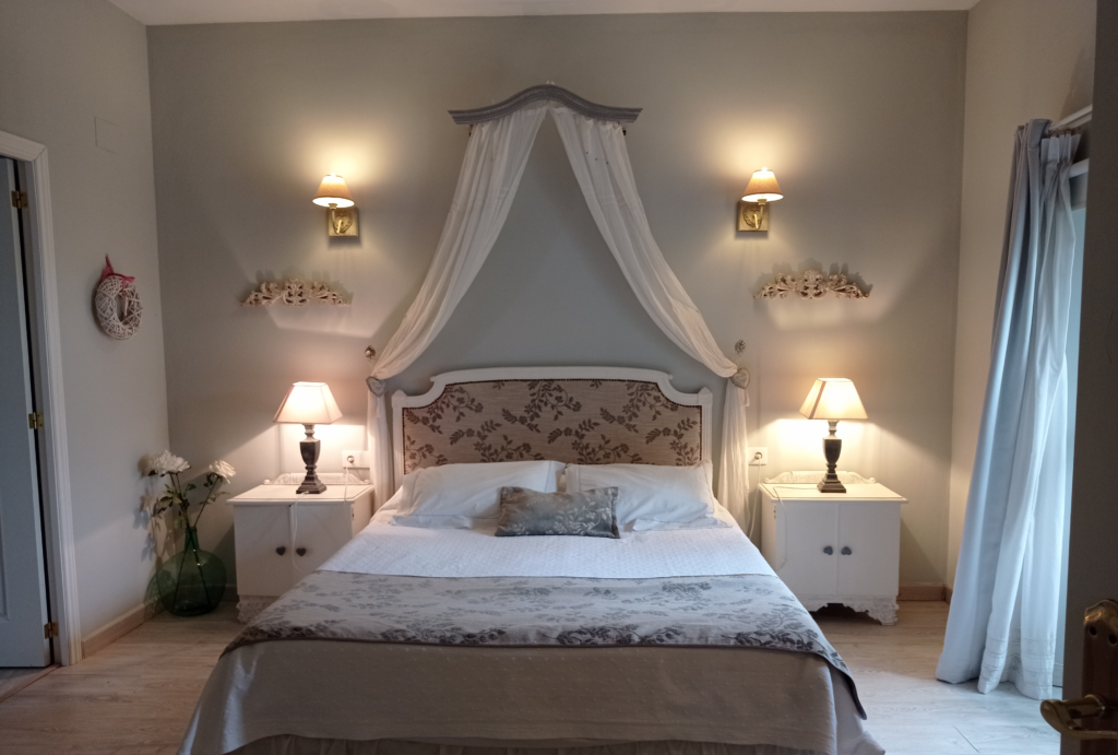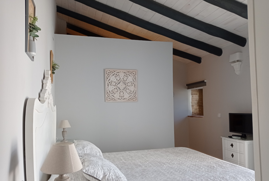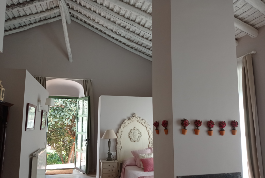 Gracias a su acceso directo al jardín mediante escaleras de bóveda, podrás disfrutar de un pequeño y fresco espacio exterior bajo la sombra de un gran níspero, perfecto para tomar el aire y sentir la tranquilidad del entorno. Además, esta suite dispone de un office con minibar funcional (frigorífico, microondas y cafetera de cápsulas), combinando comodidad y encanto rural.